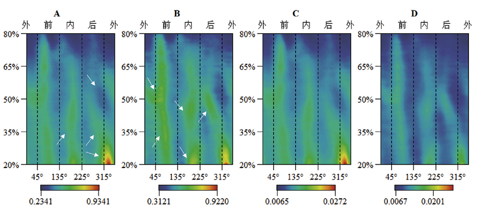 Fig.2 Mean morphometric maps of male and female A, B: Standardized by maximum thickness; C, D: Standardized by biomechanical length; A, C: males; B, D: females; The white arrows indicate the positions that reflect the difference in thickness distribution between male and female