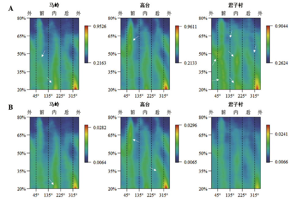 Fig.3 Mean morphometric maps of different populations A: Standardized by maximum thickness; B: Standardized by biomechanical length; The white arrows indicate the positions that reflect the differences in thickness distribution between different populations. From left to right: Maling, Gaotai, Junzicun.