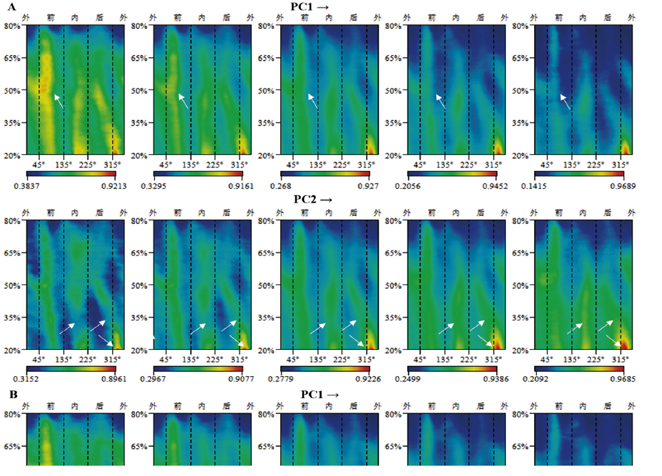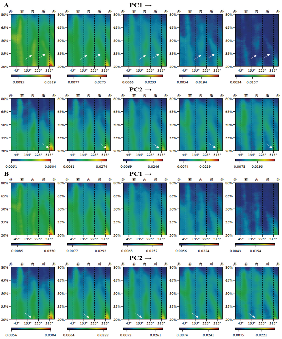 Fig.7 The changing pattern of morphometric maps corresponding to the PCA results after standardized by biomechanical length A: The changing pattern of morphometric maps corresponding to the PCA results of all specimens for demonstrating gender differences primarily; B: The changing pattern of morphometric maps corresponding to the PCA results of all male specimens for demonstrating population differences; →:the direction which the PC value changes from small to large in the PCA results. The white arrows indicate the positions that reflect the differences in thickness distribution between different genders or populations