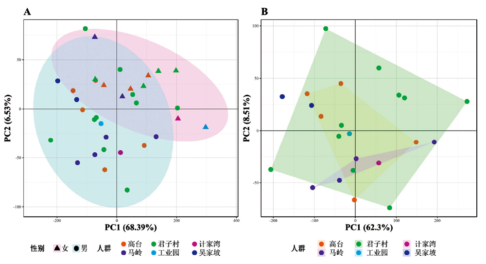 Fig.4 The results of PCA after standardized by maximum thickness A: The PCA results of all specimens for demonstrating gender differences primarily. B: The PCA results of all male specimens for demonstrating population differences