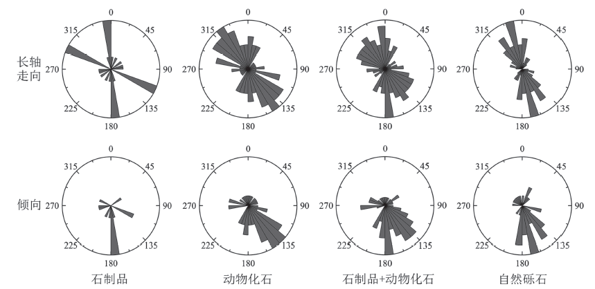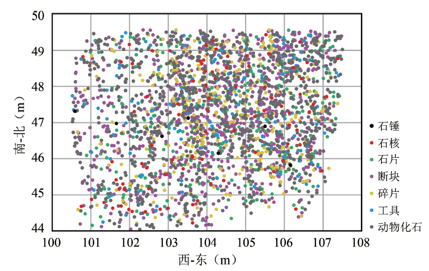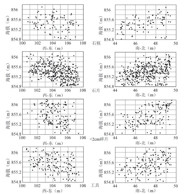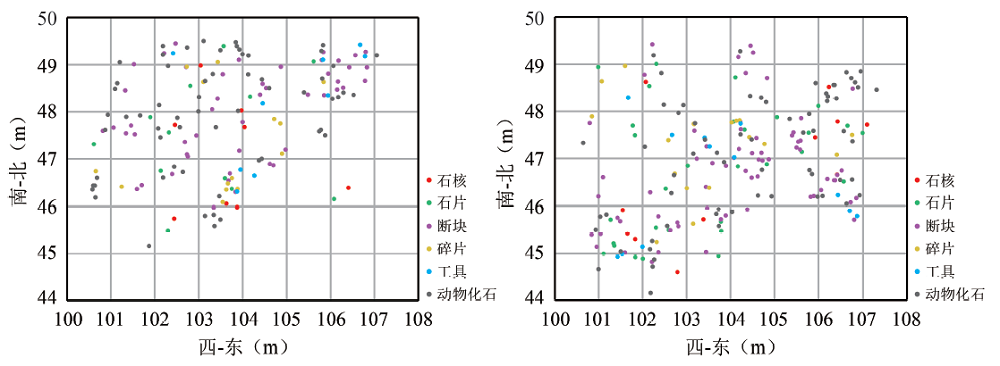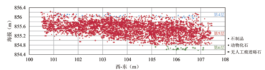 Layer 5 was buried mainly in grey-yellow and grey-green silts, fine sands and clays, and several coarse sand belts and thin beds with a few pebbles encased in the deposit. Stone artifacts are basically unabraded and fresh, and display a coherent assemblage composition, with core and debitage accounting for 3.74%, 89.67% respectively. Artifacts both in horizontal and vertical space show dense accumulations, however, some minor linear and circle patterns can be recognized. The proportion of flaking debris smaller than 20 mm is about 58.7% less than that of the debitage size distribution experiment data obtained by authors of this paper. In addition, the archaeological materials show relatively obvious preferred orientation and inclination. Multiple lines of evidence above suggest that layer 5 has been preserved in a near-primary context and only disturbed by some moderate hydraulic forces occasionally, which mainly results in a large amount of smaller debitage washed out from the site, and has altered the original site configurations to some extent. The assemblage integrity of this layer is still relatively high as a whole and suitable for analyzing early hominin behaviors except the spatial analysis. Layer 4 was buried in fine sands with a few pebbles, while layer 6 was covered totally in sand-gravel. From the qualitative point of view, these two layers have been buried in secondary environments where artifacts were transported by water flows from other areas nearby.