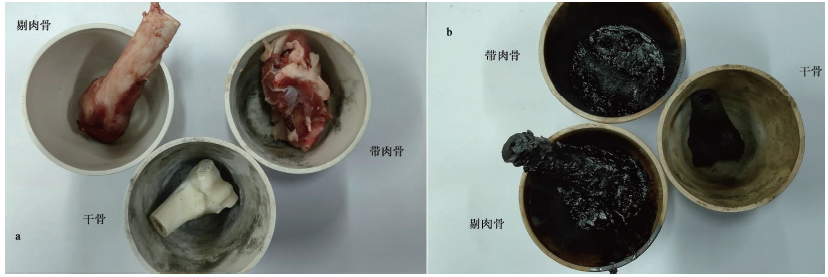 | 骨骼状态 Sample status 加热温度 Temperature | 带肉骨 Fleshed bone | 剔肉骨 Defleshed bone | 干骨 Dry bone |