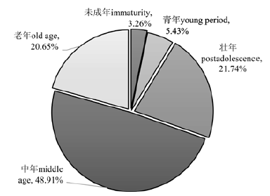 | 壮年期/postadolescence(24-35岁) | 6 | 12.77% | 13 | 33.33% | 1 | 16.67% | 20 | 21.74% |