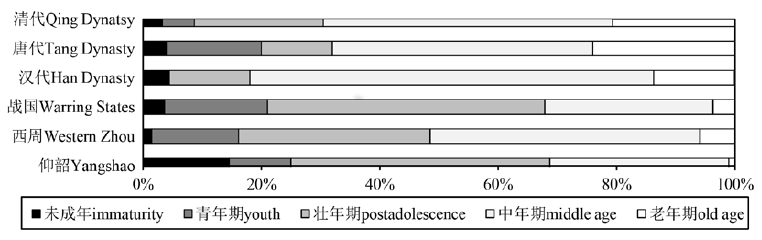 | 时代period | 组别sites | 个体n | 未成年% immaturity | 青年期% young period | 壮年期% postadolescent | 中年期% middle age | 老年期% old age |