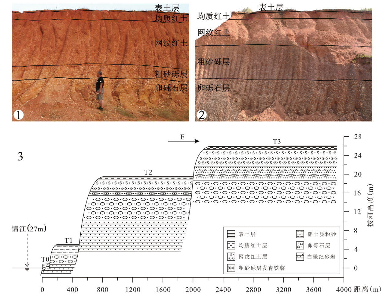 Fig.2 The representative stratigraphic profiles of the Paleolithic sites on the second and third terraces of the Jinjiang river and the terrace development of the Jinjiang river
