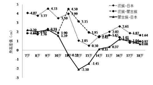 Differences of maximum growth age in height, mass among Han, Mongolian and Japanese students