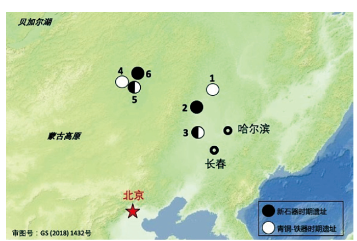 1.大古堆遗址;2.洪河村遗址;3.后套木嘎遗址;4.蘑菇山鲜卑遗址;5.扎赉诺尔遗址;6.五七农场遗址