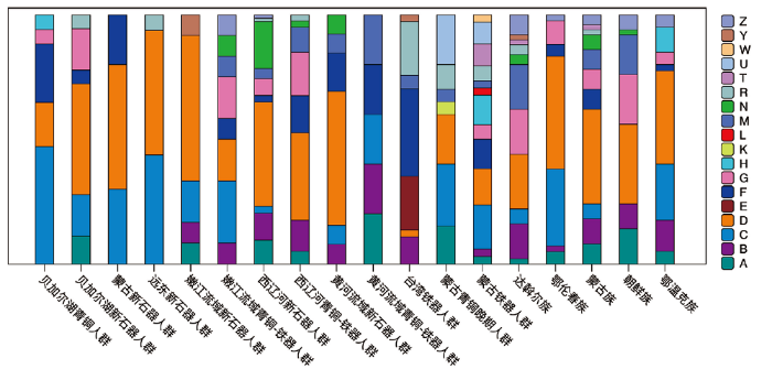 嫩江流域古代人群与其他古代及现代人群线粒体单倍群频率示意图