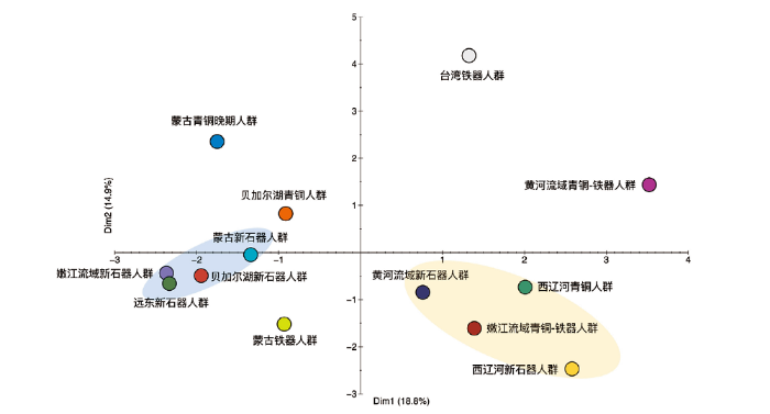 嫩江流域早期人群所处的遗传聚类用浅蓝色表示,嫩江流域晚期人群所处的遗传聚类用浅黄色表示