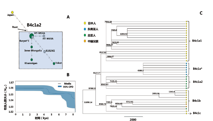 A)单倍群B4c1a2的中介网络图/The network of haplogroup B4cla2;B)单倍群B4c1的贝叶斯Skyline曲线 The Bayesian Skyline plots of Haplogroup B4c1 showing the maternal effective population size history;C)单倍群B4c1序列的贝叶斯树,分支上的数字代表分支的分歧时间,其中B4c1a2的共祖时间是大约距今8567年