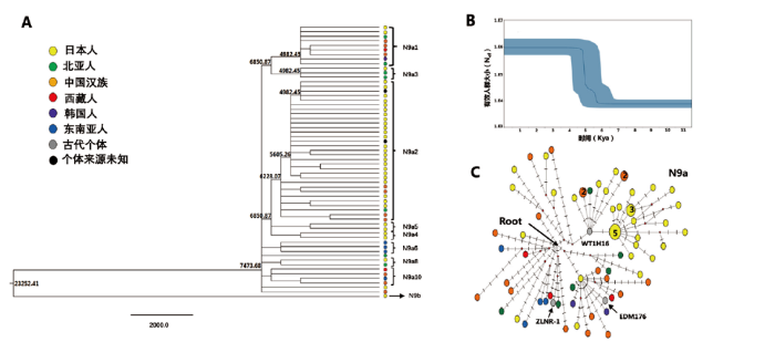 (A) 单倍群N9a序列的贝叶斯树,分支上的数字代表分支的分歧时间, 不同地理来源的个体应用不同的颜色表示,每个个体的Genbank 号见附