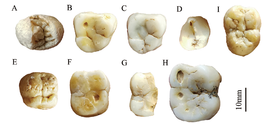 | 图2 梅子湾大洞巨猿牙齿 A. 右P4,CYMW001;B. 左M3,CYMW002; C. 左M3,CYMW003;D. 右p3,CYMW004; E. 左p4,CYMW005; F. 右m1,CYMW006; G. 右m1,CYMW007;H. 左m2,CYMW008;I. 右m3,CYMW009 |