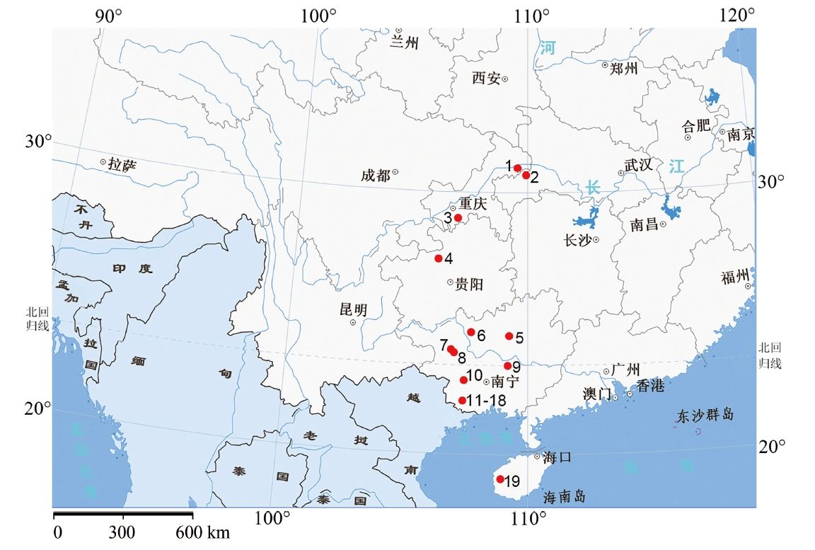 图4 中国南方及东南亚地区巨猿化石地点分布图(审图号:4071688466) 1.重庆巫山龙骨坡 (Longgupo site in Wushan, Chongqing Municipality)[3];2.湖北建始龙骨洞 (Longgudong in Jianshi, Hubei Province)[24];3.重庆武隆梅子湾大洞 (Meiziwan Cave in Wulong, Chongqing Municipality);4.贵州毕节扒耳岩洞 (Pa’eryan Cave in Bijie, Guizhou Province)[7];5.广西柳城巨猿洞 (Gigantopithecus Cave in Liucheng, Guangxi ZAR)[26];6.广西巴马莫弄山 (Monongshan site of Bama, Guangxi ZAR)[4];7.广西田东吹风洞(Chuifeng Cave of Tiandong, Guangxi ZAR)[15⇓-17];8.广西田东么会洞 (Mohui Cave of Tiandong, Guangxi ZAR)[24];9.广西武呜拉利山洞 (Lalishan Cave in Wuming, Guangxi ZAR)[5];10.广西大新黑洞(Black cave in Daxin, Guangxi ZAR)[23];11-18.广西崇左百孔洞、缺缺洞、三合大洞、泊岳山巨猿洞、岩亮洞、双坛洞、合江洞、一线天洞 (Baikong Cave, Queque Cave, Sanhe Cave, Juyuan Cave in Boyue Mountain, Yanliang Cave, Shuangtan Cave, Hejiang Cave and Yixiantian Cave in Chongzuo, Guangxi ZAR)[12⇓-14,18⇓⇓ -21];19.海南昌江信冲洞(Xingchong Cave in Changjiang, Hainan Province)[29]